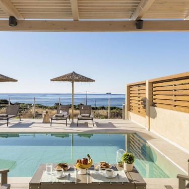 Kiotari Akti Beachfront Villas are a small collection of modern private villas located just steps from the sea on the peaceful south-east coast of Rhodes. The villas offer beautiful sea views, private swimming pools and spacious terraces, creating an ideal setting for travellers looking for a relaxing beachfront villa stay.