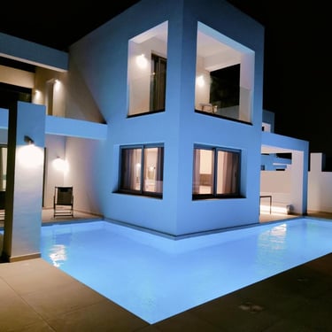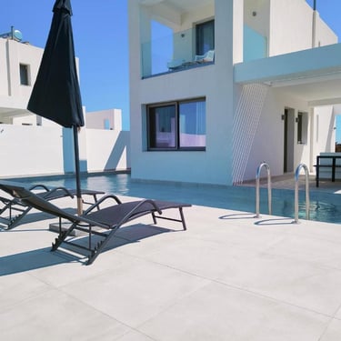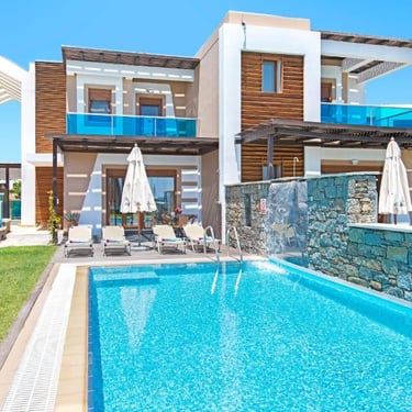 Each villa features contemporary design, spacious terraces and a private swimming pool, making them ideal for families or groups looking for comfort and privacy. The villas combine modern luxury with a relaxed village atmosphere, offering a great base for exploring nearby beaches and the famous village of Lindos.