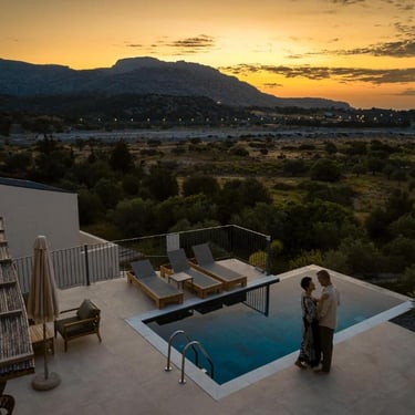 Each villa features its own private pool, stylish interiors and relaxing outdoor spaces. The villas are just a short drive from some of the most unspoiled beaches in South Rhodes, making them ideal for couples or small groups who want privacy while still being close to the sea.